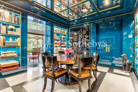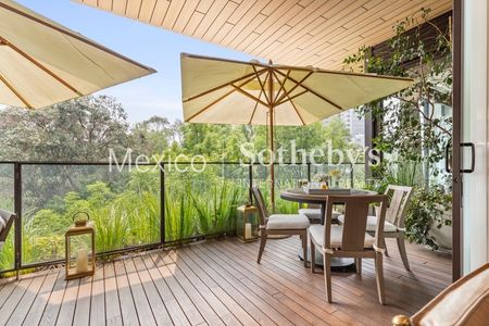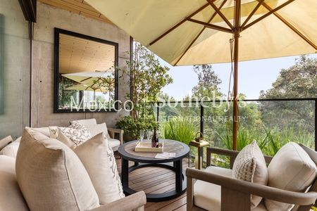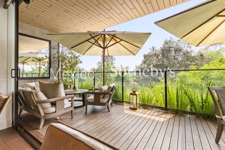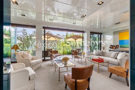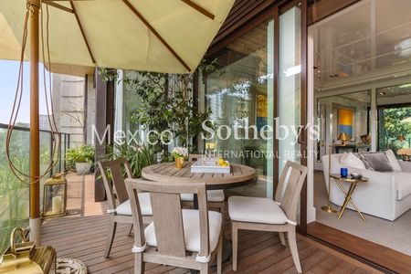La combinación de materiales es una clave del decorador, el cual se siente presente en todos los ambientes. Traduciendo su mentalidad, desde la cocina y todos los trabajos de madera fueron hechos e importados de España, hasta la terraza amplia y flotando en la copa de los árboles del Bosque de Chapultepec, se logra un espacio mágico.