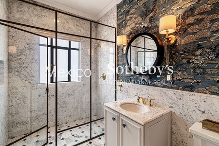 Desde su imponente fachada hasta sus interiores únicos, la propiedad ofrece una colección de elementos arquitectónicos y decorativos de gran valor: mármol de Carrara en una sola pieza, pisos originales de parquet, mosaicos sevillanos incrustados, tapices italianos, chimeneas de piedra esculpida y candiles originales de época que aportan carácter y sofisticación a cada espacio. Los muebles empotrados han sido restaurados respetando el diseño de mediados de siglo.