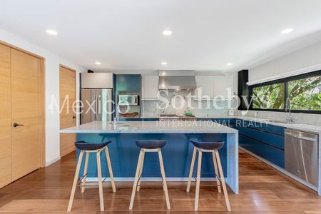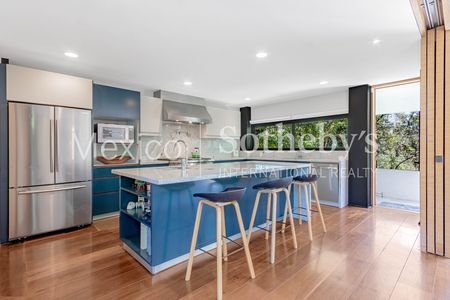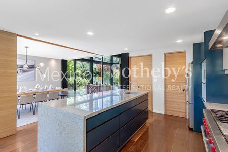 La cocina es un espacio gourmet con una gran isla de granito premium, doble tarja y parrilla profesional Wolf. En el interior, los techos alcanzan hasta 6.5 metros de altura y los pisos de roble estufado brindan calidez y elegancia en toda la casa. Las recámaras y áreas sociales cuentan con iluminación indirecta y ventanas de doble cristal para mayor confort térmico y acústico.