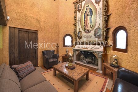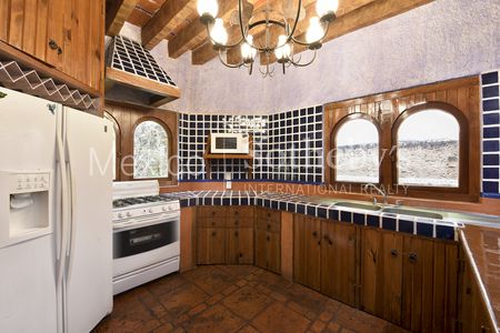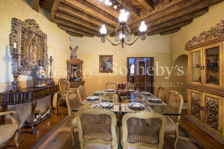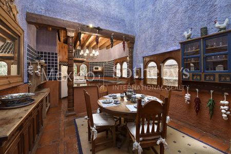 La propiedad cuenta con cuatro habitaciones, dos ubicadas en la planta alta, ambas con techos tipo bóveda española, baño privado y vestidor. Las otras dos habitaciones están en la planta baja, garantizando fácil accesibilidad y también equipadas con baño y vestidor. El área social incluye una sala con chimenea, ideal para momentos acogedores, y un antecomedor con techos de doble altura con hermosos vitrales, lo que brinda una sensación de amplitud y elegancia.