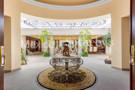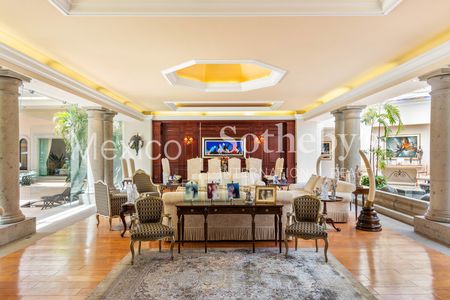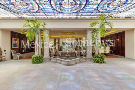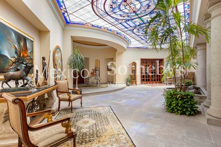 El vestíbulo principal tiene una hermosa fuente interior custodiada por 4 columnas de cantera y veranda con vitral de 12.45 x 4.5 metros estilo clásico en el techo que ilumina toda la zona social de la casa en forma natural, dando paso a la sala principal, salón comedor con capacidad para 14 personas y la sala, con bóvedas decorativas y vistas a la alberca interior.