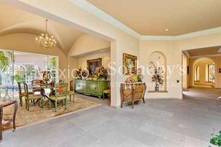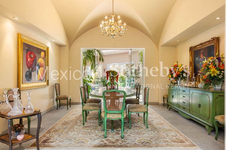 Antecomedor con techo abovedado con vistas a la alberca y tiene jardín interior que nos lleva a las áreas privadas por el family o sala de TV.