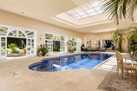 La alberca realizada con mosaico veneciano de 12.5 m x 5m, con hidromasaje tiene tres grandes domos y está rodeada por un gran patio de cantera tiene barra con tarja y un baño completo ideal para reuniones sociales y salida al jardín.
