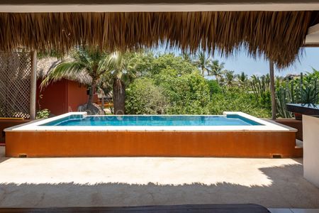 En planta alta, un área social exterior, con techo de palapa, cocina equipada abierta con barra de granito, comedor y sala con gran terraza y una piscina volada.