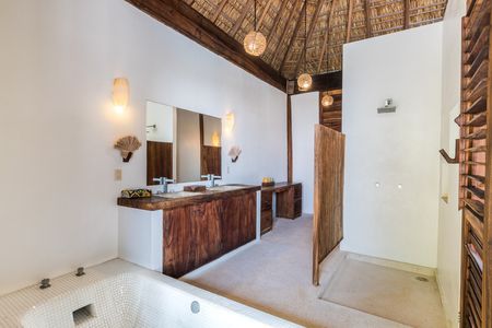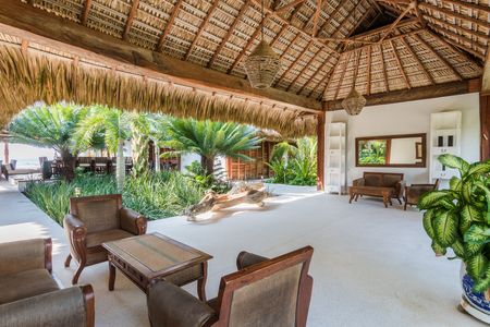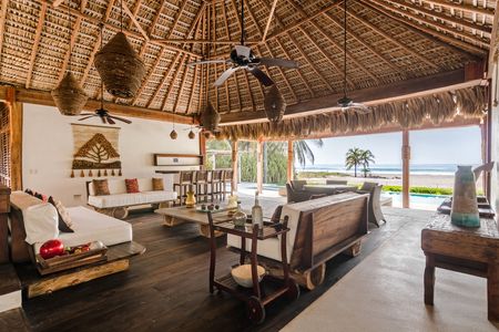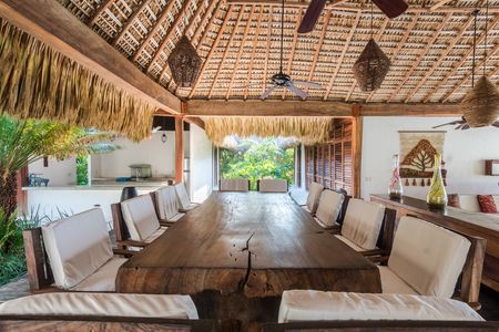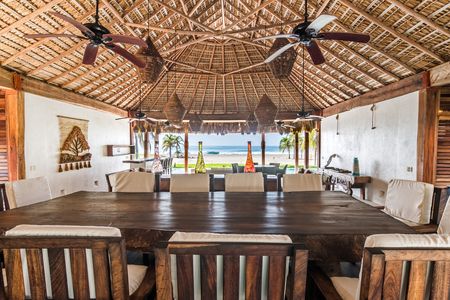 Bajo una gran Palapa sala con barra de bar y comedor que se fusionan con la terraza para gozar de la vista.