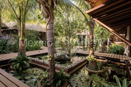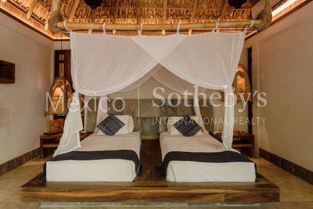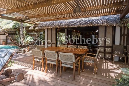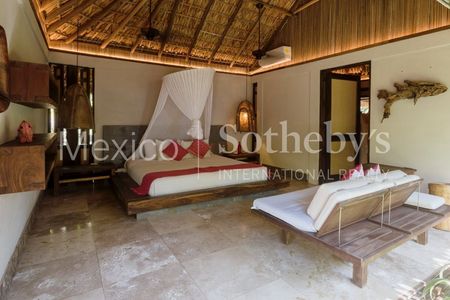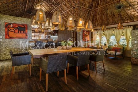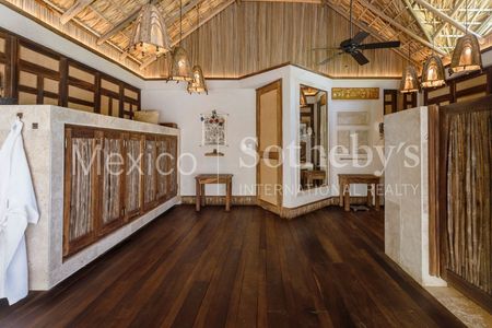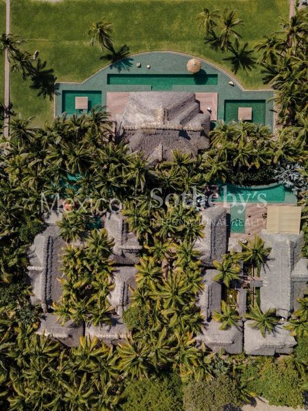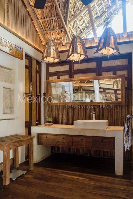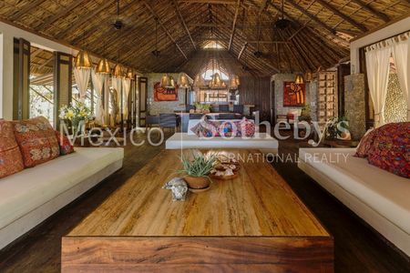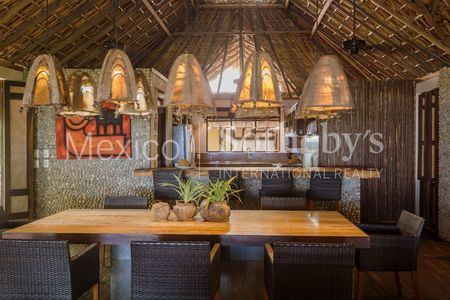 Toda la casa con acabados en madera , cocina abierta con barra , Sala y comedor con salida a una terraza divina equipada con horno para pizzas y asador, jacuzzi y y una maravillosa alberca llena de palmeras. Lo mejor, la vista al mar en su primera línea es de playa.