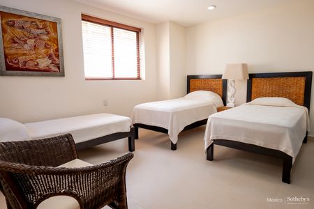 Está distribuido en 2 niveles; en planta baja área social con sala de tv, comedor, cocina, medio baño de visitas, recámara completa con baño y una terraza exterior, el magnífico jardín y una palapa con asador, barra y horno de pizzas; además la alberca infinita. En planta alta, tres recámaras, la principal con vestidor y baño y las secundarias con baño completo.
