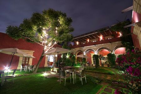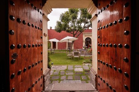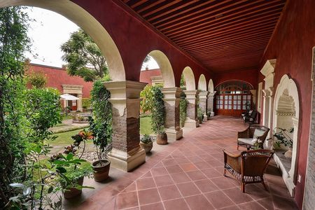 Otorgando le una personalidad única y con las comodidades de un Hostal de lujo. Acceso de la calle por el portón principal original, donde se encuentra actualmente la recepción que da acceso al hermoso jardín con su clásica fuente al centro rodeada de 4 mesas y sus sombrillas creando un agradable espacio al aire libre.