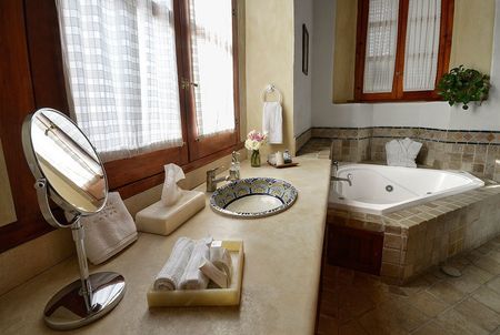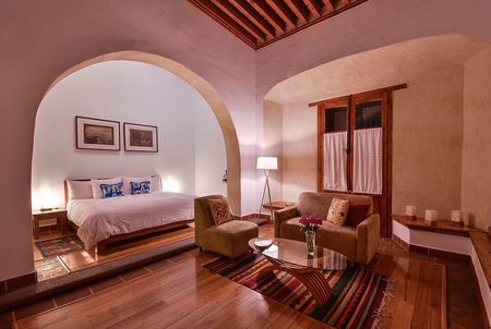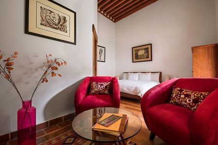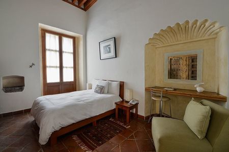 Alrededor del jardín se ubican las 8 hermosas habitaciones cada una con baño privado. El porche cubierto está enmarcado por la clásica arcada exterior que da al jardín y con acceso a la espectacular biblioteca de 2 niveles con capacidad para 12 personas en su interior. Junto esta la sala principal con chimenea donde se encuentra el piano, este salón se une al comedor que tiene 4 mesas para 4 comensales cada una. En planta baja también se ubican las oficinas administrativas, 2 medios baños, la cocina, bodegas y el almacén del hotel zona de empleados con baño. Tiene capacidad para 5-6 autos y cámaras de seguridad con monitor. El precio incluye todo el mobiliario excepto algunas obras escultóricas y pictóricas.