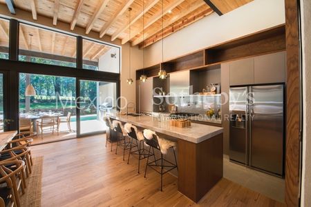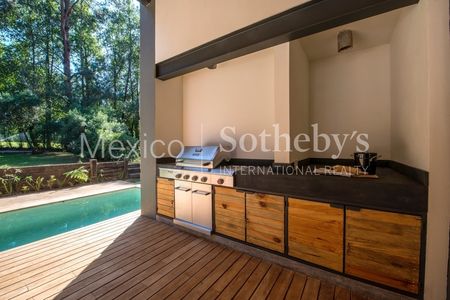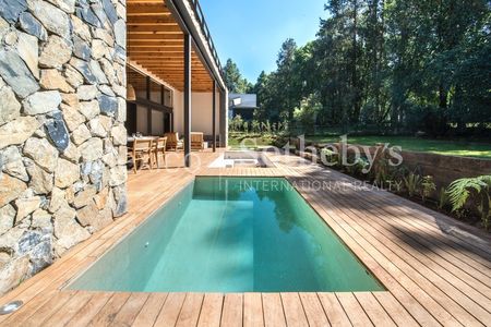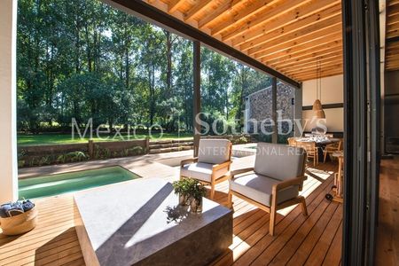Imponente casa de fin de semana ubicada en un terreno de 925m2 en una de las partes más nuevas de Rancho Avándaro. Con su directa conexión al campo de golf y su triple fairway justo entre los hoyos 5 y 6, el jardín privado se abre completamente a la naturaleza y la arquitectura aprovecha al 100% el sol en una orientación de por sí privilegiada por su ubicación dentro de una de las zonas mejor iluminadas y más cálidas del conjunto. Gracias a esto, la casa se mantiene iluminada a lo largo de todo el día y las recámaras en planta alta conservan toda esa energía solar para mantener una temperatura confortable durante la noche que es justo cuando en el exterior el clima es mucho más frío.