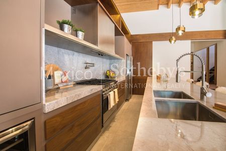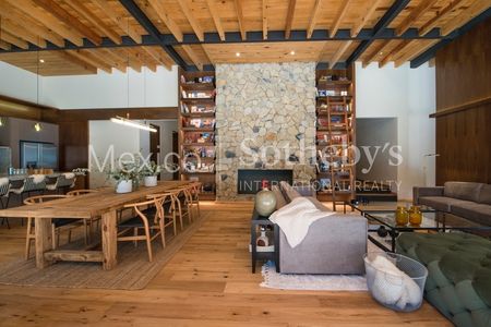En planta baja la casa cuenta con un estudio completamente independiente, entradas principal y de servicio, zona social con cocina, comedor, sala y family que se integran y conviven en un gran espacio que tiene como pieza central una gran chimenea de gas terminada en piedra de la región y flanqueada por una enorme biblioteca. Toda esta zona social se abre y se conecta directamente con la terraza que cuenta con parrilla, comedor y sala exteriores, jacuzzi, firepit y alberca; aparte de la hermosa vista hacia el jardín privado que se conecta al fondo con el campo de golf.
